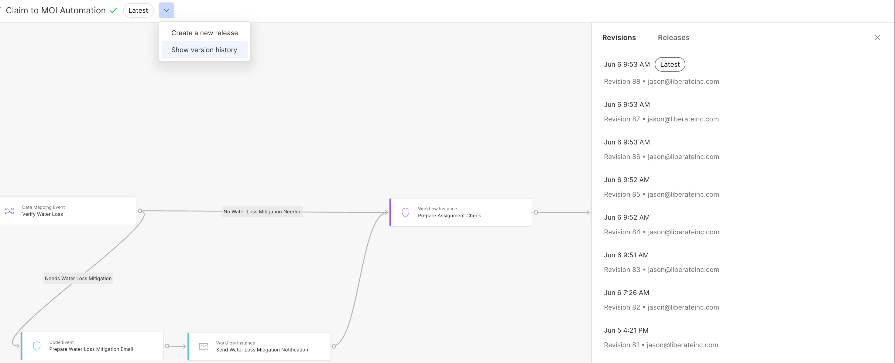 - Accessing Revision History: To view all revisions of a workflow, click on the "Version History" option located at the top of the Liberate canvas. This will provide a comprehensive list of all saved revisions.
