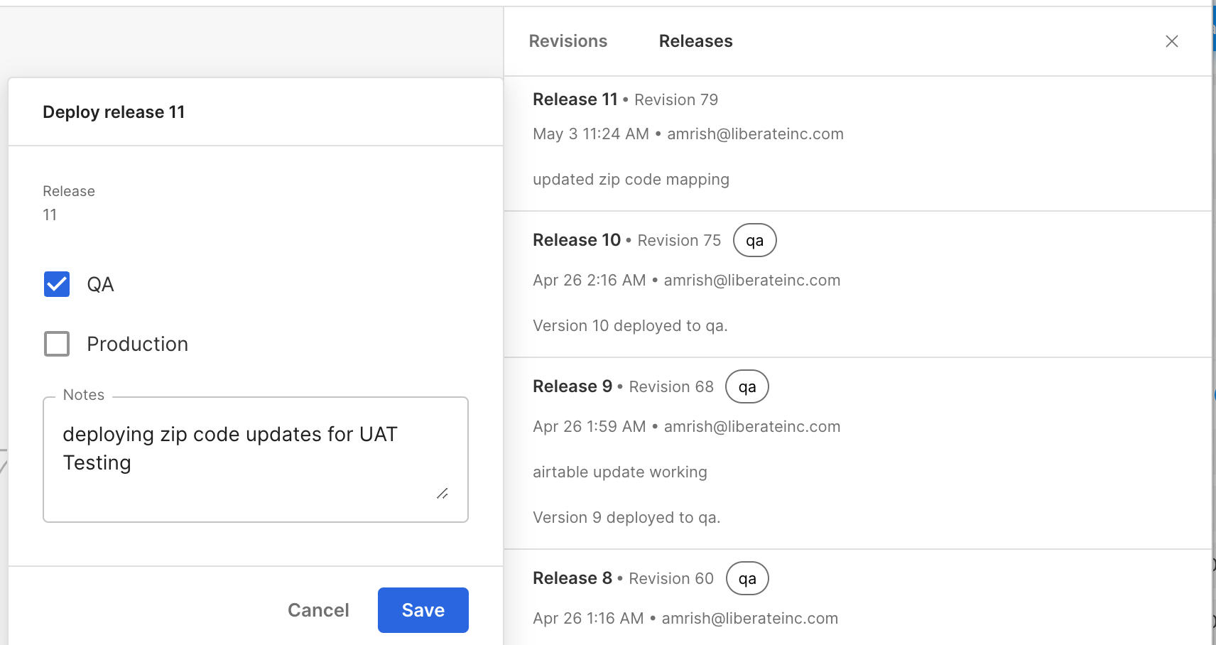 Liberate offers powerful release management capabilities that enable teams to effectively version, create release artifacts, and deploy their workflows to QA or production environments. This documentation will guide you through the process of managing releases and revisions in Liberate.